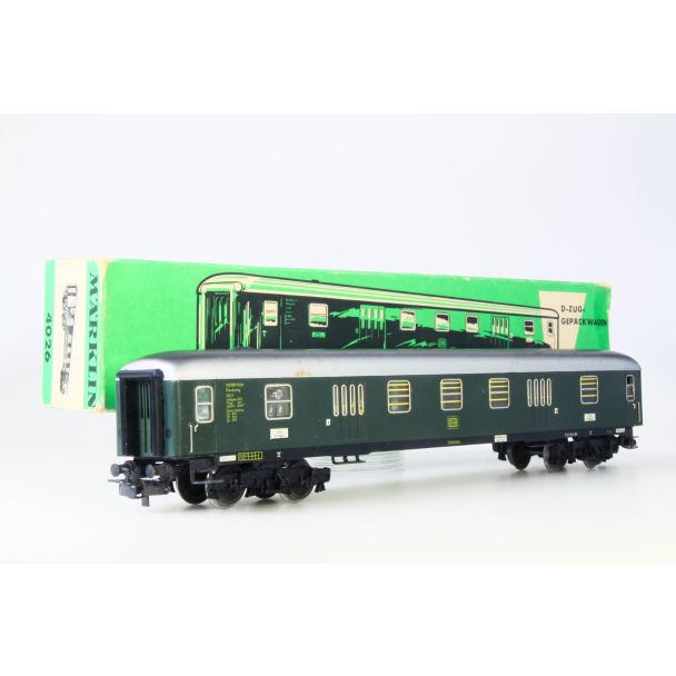 D-Zug-Gepäckwagen, 4 Achsen, Blech, Pwg4ymg der DB. grün, Fenster mit Cellonscheiben, teilweise gelb schraffiert, Gummiwulstübergänge, eingesetzte Fenster mit silbernem Rand, Aufschrift Pw4ymg. Drehgestelle Minden-Deutz, K 7. Länge 24cm.
