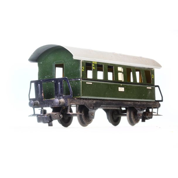 Personenwagen. Version 5 nach Koll. Grüner Wagenkasten aus Blech mit Plattformen und 2 Achsen. Schilder eben mit Aufschrift 2. Klasse und Bi 20t58Pl 13,9 m. Fenster mit Cellonscheiben. Nadellagerachsen, BK 7. Länge 13.5 cm.