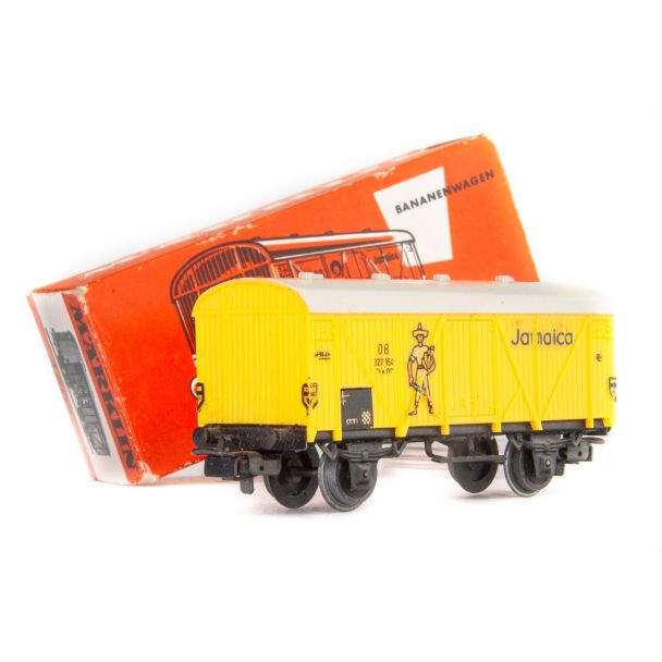 MÄRKLIN 307/2 (4509), Version 3 nach Koll. Gehäuse aus gelbem Kunststoff. Blaue Aufschrift Jamaica und Abbildung Bananenpflücker als Schiebebild. Abgeflachtes weisses Dach mit Lüftern, grau getönt, erhabene Aufschrift 307 DB 327 154 Tko 02 RIV, Gattungsschild, quadratisches Schiebebild.