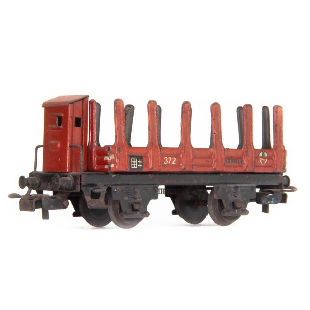 MÄRKLIN 372 Rungenwagen mit Bremserhaus. Version 8 nach Kroll. 2 Achsen. Blech, braun (Umbra), innen grau. Schwaze Aufschrift MÄRKLIN, weiße Aufschrift 372, schwarze Stirnseitenaufschrift Made in Germany. Bremserhaus, offenes Achslager mit vier Federblättern, Kupplung BK 5, Länge 10 cm.