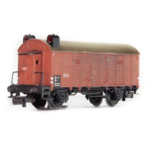 Typ: Gedeckter Güterwagen mit Aufbau aus Guss und Tonnendach, Bremserhaus, Fahrgestell schwarz brüniert, Außenwände mit Bretternachbildung. Länge 9 cm.