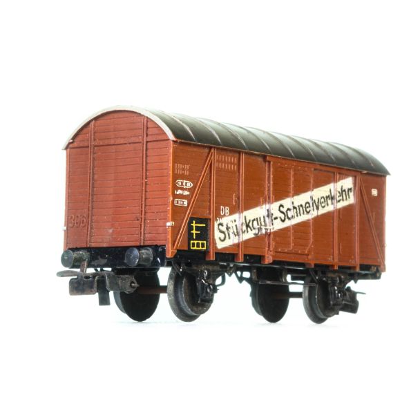 Gedeckter Güterwagen Gmh 39 der Deutschen Bundesbahn mit Aufbau aus Kunststoff, Fahrgestell und Stufe unter der angedeuteten Schiebetür schwarz brüniert, Außenwände mit Bretternachbildung, Tonnendach. Länge 10 cm.
