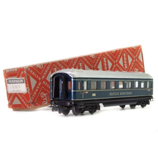 FD-Zug-Wagen (Schürzenwagen) aus der 346er Serie. Dunkelblaues Gehäuse aus Stahlblech. 2. Klasse. Aufschrift 16516 K4 B4ü und silbern DEUTSCHE BUNDESBAHN. Cellonscheiben. Dach silbern. Drehgestell im Boden verschraubt.