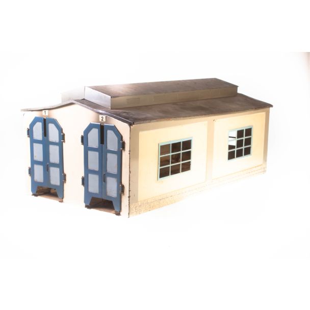 33x18x15 cm, Blech, für 2 Gleise. beige-blau, Satteldach, automatische Türen, durchbrochene Fenster. Dachaufbau.