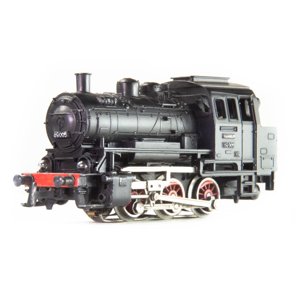 Typ: Tenderlokomotive der BR 89 der DB. Aufbau aus Kunststoff, schwarz. Fahrgestell aus Zinkdruckguss. Achsfolge C. Radkörper rot ausgelegt. Länge 11 cm.