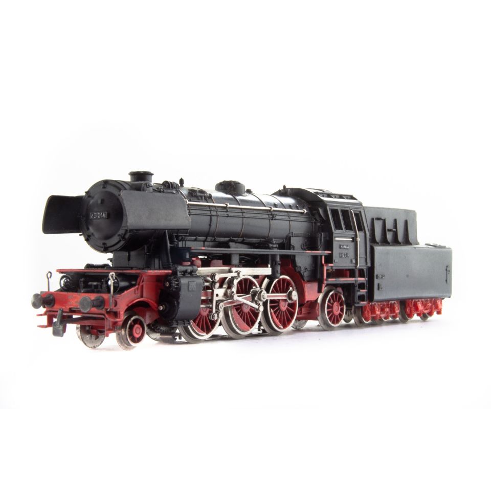 MÄRKLIN Lok mit Tender DA800. Version 1 nach Kroll. Achsfolge 1'C1', BR 23 der DB, schwarz. Fahrgestell aus Guß, Aufbau aus Kunststoff. Zwei Lampen mit Lampenstangen. Kleine Windfeitbleche (Wille) gesteckt, Betr.-Nr. 23 014, Aufschrift DA800, Führerhaus, hinten geschlossen, Fronttreppe rot. Vor- u. Nachlaufgestell Guß, rot. Handschalthebel, Haftreiten, vom HK 9, Schweißtender vierachsig, schwarz, Kunststoff, Aufschrift DA809, BK 5.