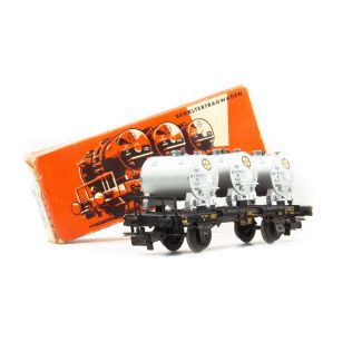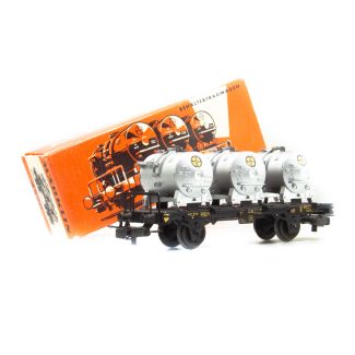 Modell derDB, Fahrgestell Blech mit Bremserbühne schwarz lackiert, darauf 3 zylindrische silberfarbige Kunststoffbehälter, durch Blechzungen auf dem Fahrgestell gehalten, jeder Behälter hat auf der Oberseite einen herausziehbaren Blechbügel (zum Verladen mit Drehkran 7051 / 7657, Behälter mit runden Bayer-Emblem auf beiden Seiten (Schiebebild), Aufschriften am Wagen Schiebebilder, Betriebsnummer 012 200, Artikelnummer 4615 (falsch).