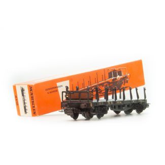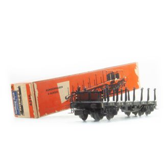 Modell der DB, zwei zweiachsige Drehgestelle, Fahrgestell Blech schwarz lackiert, Aufbau brüniertes bzw. lackiertes Blech mit vierzehn Rungen und mit Drahtringen am obe-ren Ende, Bremserbühne aufgesetzt, Beschriftungen Schiebebild, Betriebsnummer 13 392.