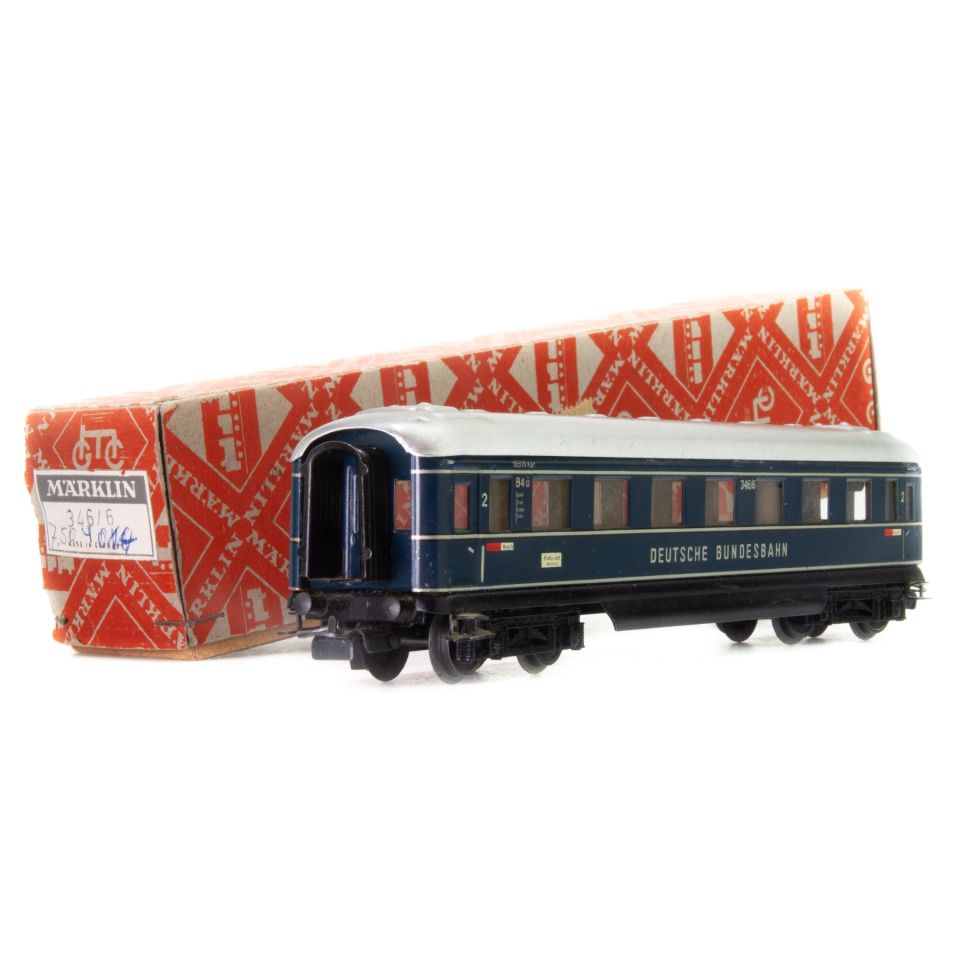 FD-Zug-Wagen (Schürzenwagen) aus der 346er Serie. Dunkelblaues Gehäuse aus Stahlblech. 2. Klasse. Aufschrift 16516 K4 B4ü und silbern DEUTSCHE BUNDESBAHN. Cellonscheiben. Dach silbern. Drehgestell im Boden verschraubt.