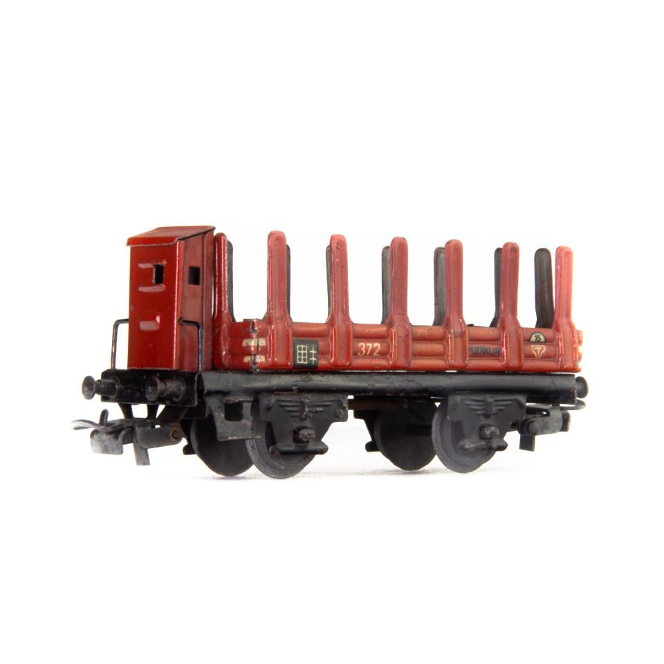 MÄRKLIN 372 Rungenwagen mit Bremserhaus. Version 8 nach Kroll. 2 Achsen. Blech, braun (Umbra), innen grau. Schwaze Aufschrift MÄRKLIN, weiße Aufschrift 372, schwarze Stirnseitenaufschrift Made in Germany. Bremserhaus, offenes Achslager mit vier Federblättern, Kupplung BK 5, Länge 10 cm.