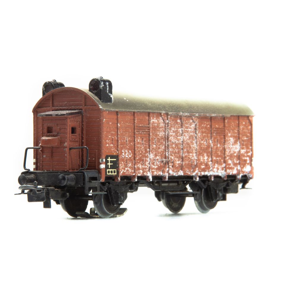 Typ: Gedeckter Güterwagen mit Aufbau aus Guss und Tonnendach, Bremserhaus, Fahrgestell schwarz brüniert, Außenwände mit Bretternachbildung. Länge 9 cm.