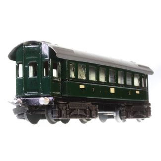 Modell vom Schnellzugwagen, zwei zweiachsige Drehgestelle, Aufbau und Fahrgestell Blech, Dach grau, abnehmbar, Aufbau grün bis mittel dunkelgrün, eine schwarze Zierlinie, Firnislacküberzug, Rahmen schwarz, Fenster mit Cellon hinterlegt, 1. und 2. Klasse.