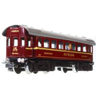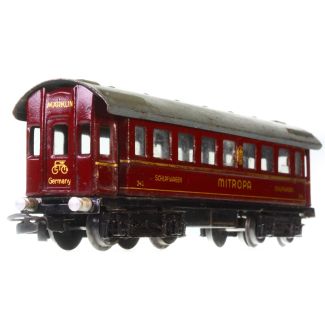 Modell vom Schlafwagen, zwei zweiachsige Drehgestelle, Aufbau und Fahrgestell Blech, Dach grau, Aufbau weinrot mit zwei goldfarbigen Zierlinien, Rahmen schwarz, Firnislacküberzug, Stirnseiten oben geschlossen, Fenster mit Cellon hinterlegt, Aufschriften goldfarbig, 343, SCHLAFWAGEN, Zierlinien mit langen, rechtwinklig abgebogenen Laschen (achsparallel).
