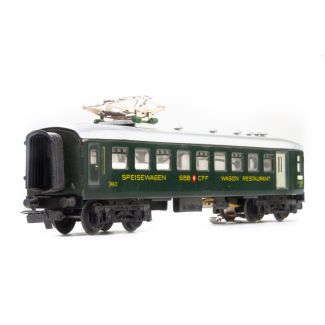 Modell der SBB, zwei zweiachsige Drehgestelle (wie bei 346/1 — 4006), Aufbau und Fahrgestell Blech, Dach abnehmbar, silberfarbig mit sechs eingesetzten Dachlüftern sowie einem Bügel, Aufbau dunkelgrün, Fahrgestell schwarz, Fenster mit Cellon hinterlegt, Aufschriften „SBB CFF" und „RESTAURANT" sowie Artikelnummer 348/2 und Kursschilder gedruckt.
