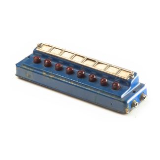Stelllpult für Spur H0 und Spur 0, Momenttaster für acht Magnetartikel (Signale, Weichen, Entkupplungsgleise etc.) mit Einspulenantrieb oder vier Magnetartikel mit Doppelspulenantrieb, Pultform, Blechgehäuse mit geschraubtem Blechrahmen für Beschriftung, acht rote Stellknöpfe, separater Anschluss für Beleuchtung des Stellpults, unten offen, Artikelnummer auf silberfarbenem Träger, Maße 12 x 3,8 x 1,5 cm (LxBxH).