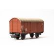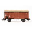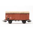 Gedeckter Güterwagen Gmh 39 der Deutschen Bundesbahn mit Aufbau aus Kunststoff, Fahrgestell und Stufe unter der angedeuteten Schiebetür schwarz brüniert, Außenwände mit Bretternachbildung, Tonnendach. Länge 10 cm.