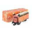 Typ: Gedeckter Güterwagen mit Aufbau aus Guss und Tonnendach, Bremserhaus, Fahrgestell schwarz brüniert, Außenwände mit Bretternachbildung. Länge 9 cm.