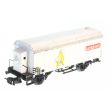 Geschlossener Güterwagen von MÄRKLIN. Zinkdruckguss, Bierwagen mit Bremserhaus, elfenbeln, rotes Feld mit weißer Aufschrift GAMBRINUS, gelber Ziegenbock mit Bierglas (mit Schablone gespritzt), erhabene Aufschrifl 324, auf anderer Stirnseite aufgesetzte Leiter. Länge 11.5 cm.