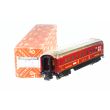 Schlafwagen (Schürzenwagen) aus der 346er Serie. Version 3 nach Koll. Gehäuse weinrot dunkel (lasurrot) aus Stahlblech, Aufschrift gelborange. Aufschrift "SCHLAFWAGEN 346/3" DSG-Signet in blassgelb. Cellonscheiben. Dach glänzend beige, Halterung genietet. Schilder eben, Wagenboden innen silbern, Faltenbalgübergänge, Drehgestell verschraubt, Stummelachsen, BK 5, Länge 20.5 cm.